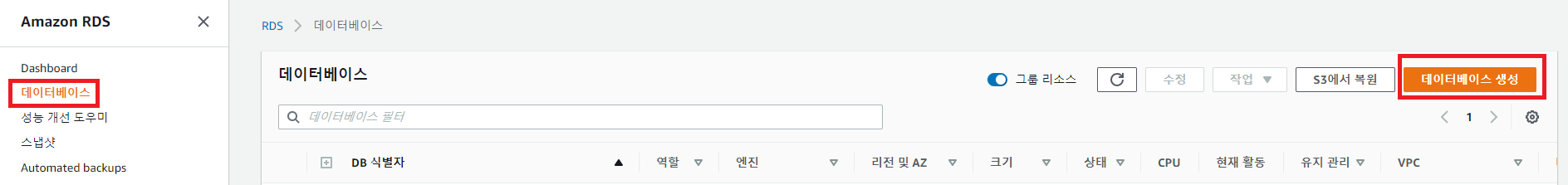 AWS홈페이지에 있는 서비스 안에 있는 데이터베이스 안에 있는 RDS를 선택해서 들어가자
