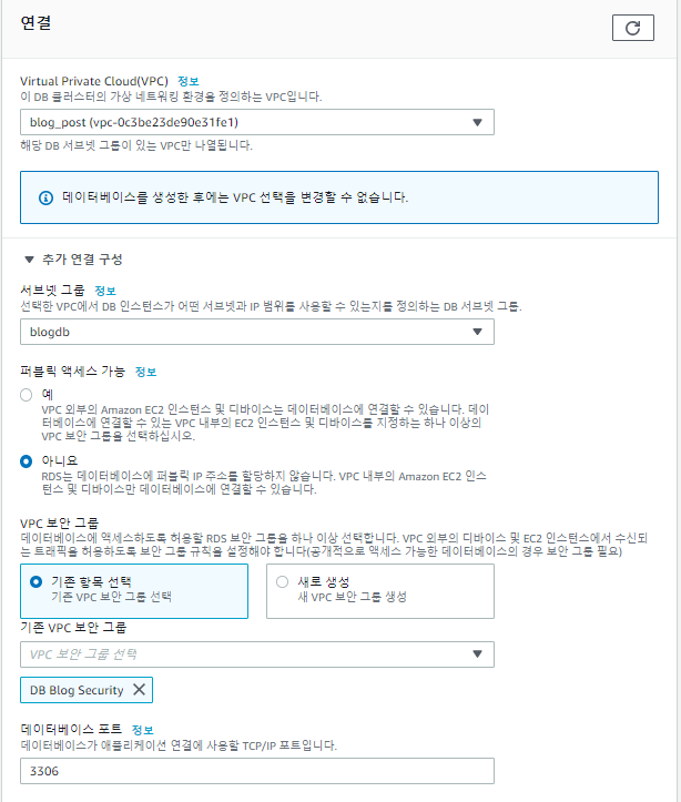 DB 인스턴스 크기는 버스 터블 클래스를 고르자 필자는 프리티어니 돈이 가장 안 나가는 것을 선택하겠다. 스토리지도 그냥 디폴트 값 사용하면 될 것이다. 이제부터 가장 중요한 부분이 연결이다.