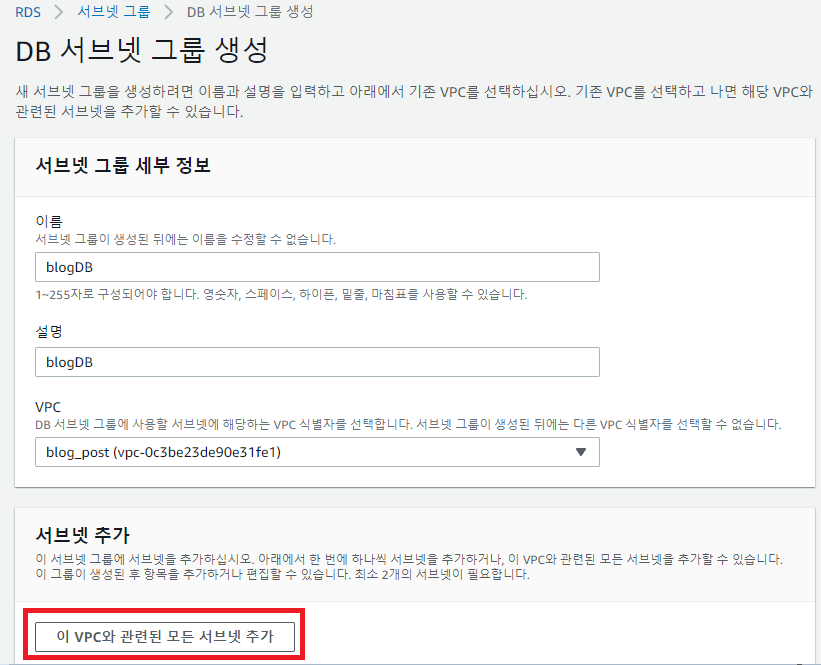 그리고 이 vpc와 관련된 모든 서브넷 추가를 누르고 생성을 누르자