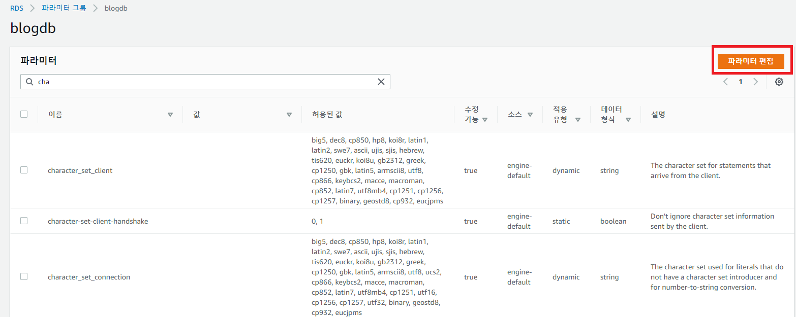방금 만든 파라미터를 다시 한번 클릭해주면 아래와 같은 모습을 볼 수 있는데 오른쪽 상단에 있는 파라미터 편집을 눌러서 편집을 해주자