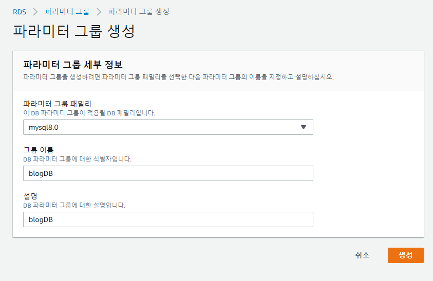 먼저 파리 미터 그룹에 들어가서 파라미터 그룹 생성을 눌러서 그룹을 생성 해주자
