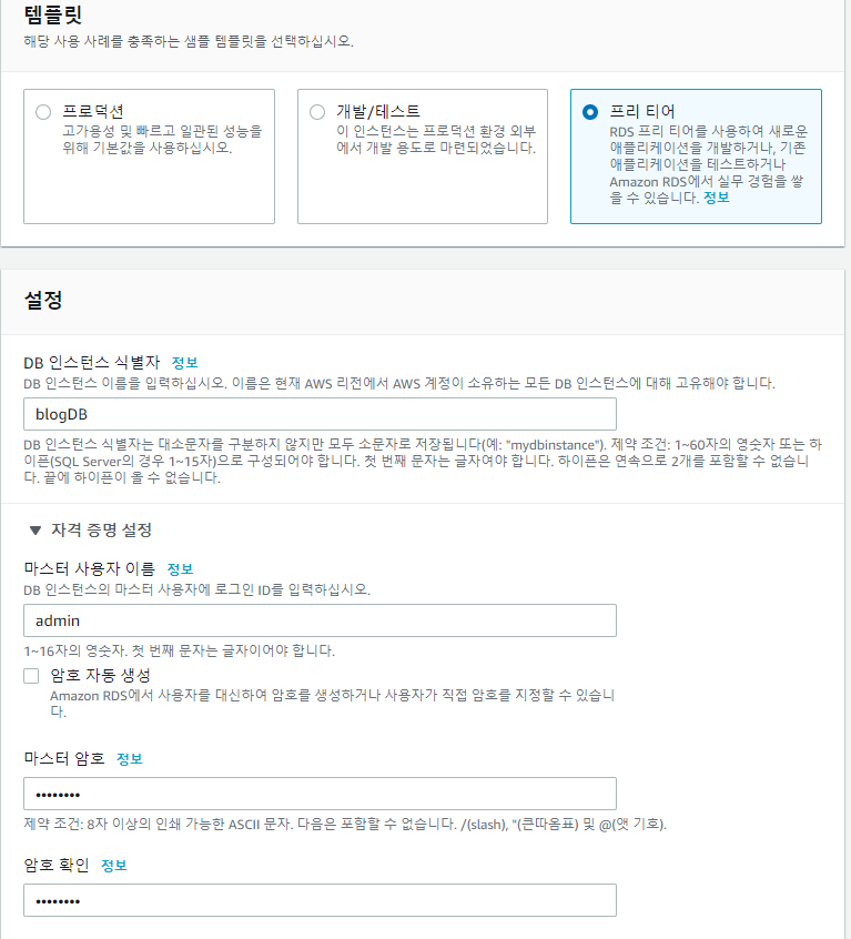 템플릿은 프리티어를 입력하고 식별자는 원하는 이름을 지어주자 그리고 마스터 사용자 이름과 마스터 암호 8자 이상으로 지어주자 여기서 마스터 암호는 절대 잊으버리면 안된다. 마스터 사용자 이름은 알 수 있지만 암호는 알 수 없다.
