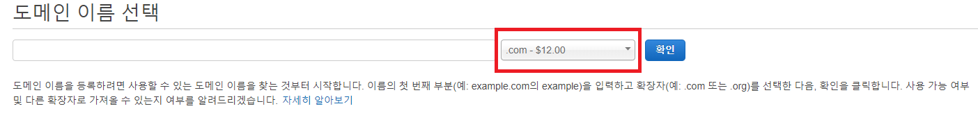 원하는 이름의 도메인을 입력해주면 된다. 빨간 박스를 뒤에 도메인들을 선택할 수 있다. 필자는 .com을 선택하겠다