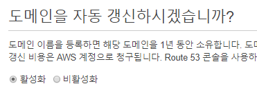 이제 본인이 입력한 도메인을 1년 동안 사용할 수 있는데 자동갱신 활성화를 하면 1년 뒤에 자동으로 결제가 되서 계속 사용 할 수있고 1년뒤 계속 사용을 안 할 거면 비활성화를 클릭해주고 이용약관을 눌러주고 주문 완료를 입력해주자