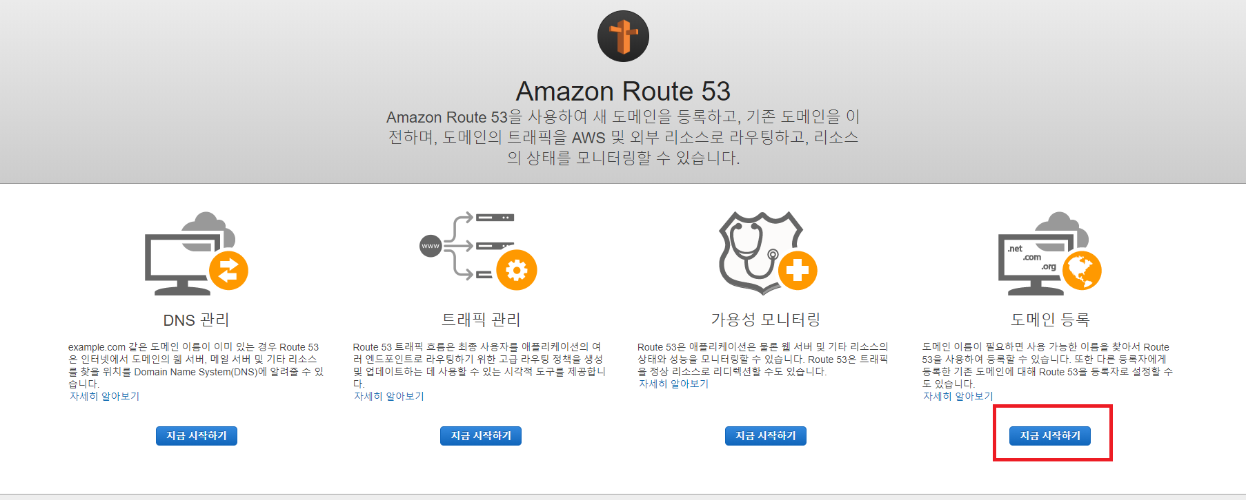 아래와 같은 화면이 보이면 도메인 등록 아래에 있는 지금 시작하기를 눌러주자