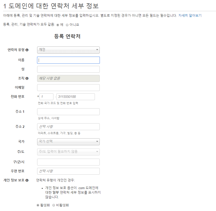 그 다음 본인의 인적 사항을 기재해주면 된다. 참고로 대한민국 국가 코드는 82 국가는 South Korea라고 적어주면 된다.